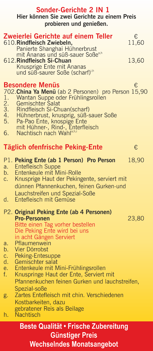 Welcome to China Restaurant Ya - Munsingen, a hidden gem located at Hauptstraße 43 in Munsingen, Germany. Renowned for its authentic Chinese cuisine, this establishment captures the essence of culinary art with every dish. The menu showcases an array of flavorful options, featuring expertly prepared vegetables and mouthwatering proteins. Notably, the Peking duck has garnered rave reviews, described as a "absolute Gaumenschmaus," delighting patrons with its crispy skin and rich flavors.